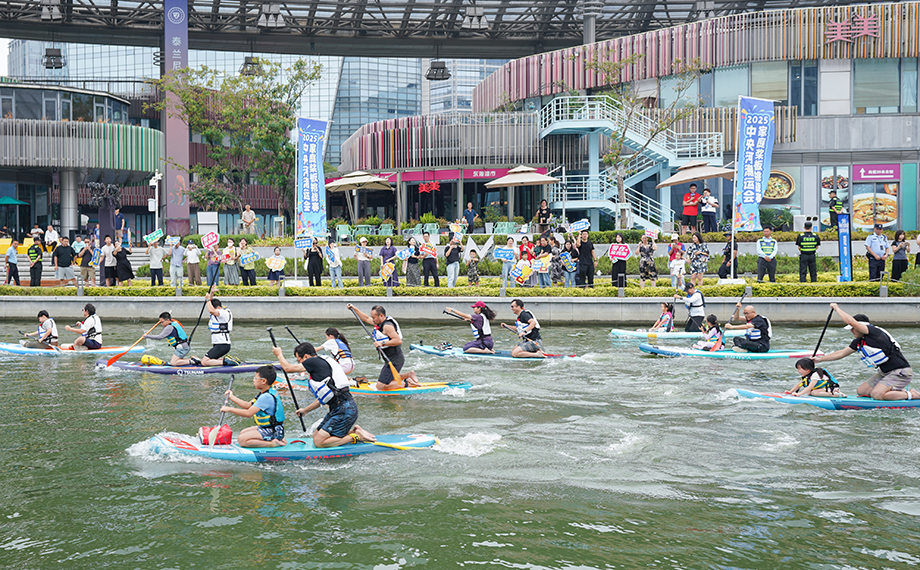 當(dāng)天,嘉年華首場活動中央河潮運會家庭槳板挑戰(zhàn)賽同期啟動。賽事以“親子協(xié)同、運動快樂、水岸融合”為主線,設(shè)置“完賽競技段300米+趣味體驗段200米”,共有100組親子家庭同舟競逐、揮槳前行,現(xiàn)場氣氛熱烈,形成一幅生動溫馨的運動畫卷。