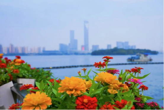 待到重陽日,還來就菊花。又是一年重陽時,湖畔百日菊競相開放,在微涼的風里搖曳。湖面隨風泛起的漣漪與菊香一同輕晃