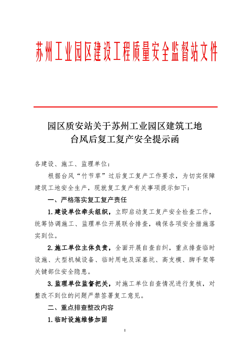 園區(qū)質(zhì)安站關(guān)于蘇州工業(yè)園區(qū)建筑工地臺(tái)風(fēng)后復(fù)工復(fù)產(chǎn)安全提示函