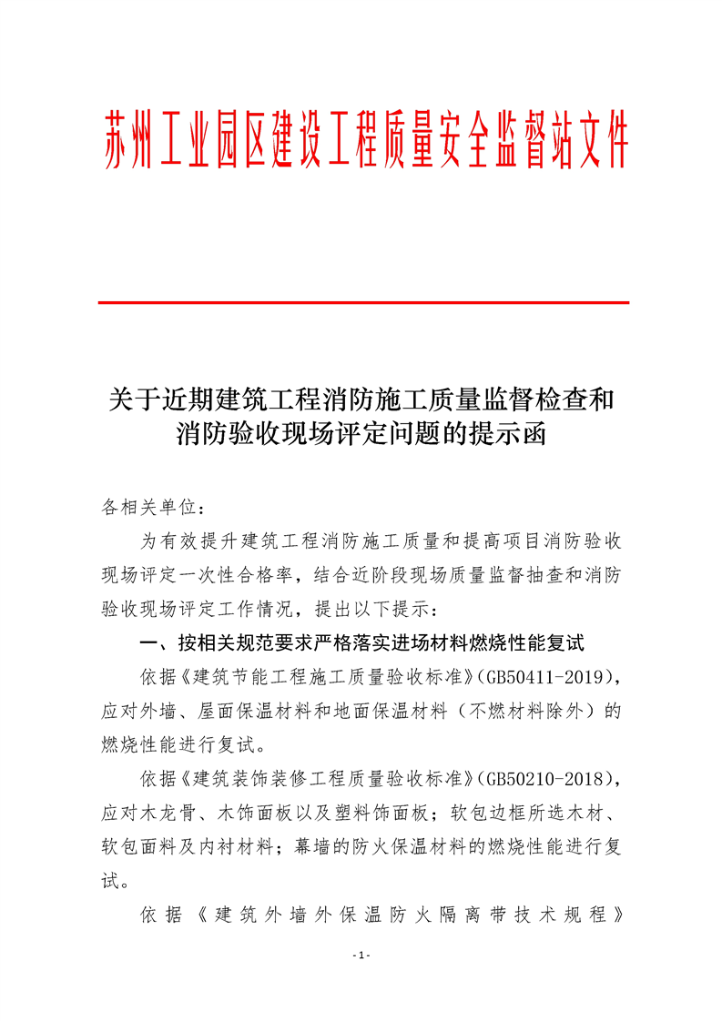 關(guān)于近期建筑工程消防施工質(zhì)量監(jiān)督檢查和消防驗(yàn)收現(xiàn)場評定問題的提示函