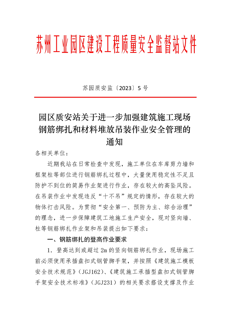 園區(qū)質(zhì)安站關(guān)于進一步加強建筑施工現(xiàn)場鋼筋綁扎和材料堆放吊裝作業(yè)安全管理的通知
