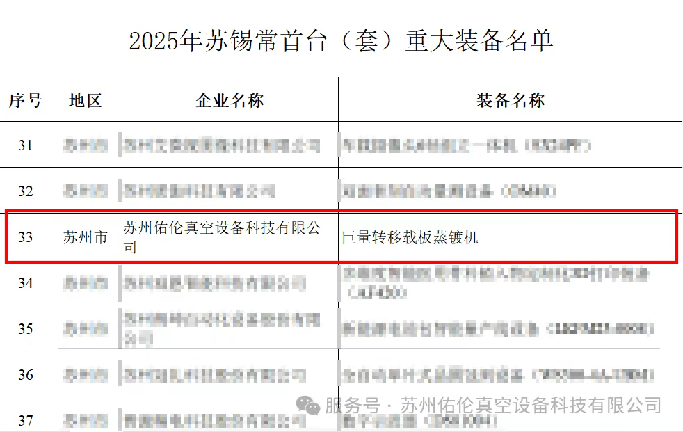 近日,蘇州工業園區科技招商中心引進企業——蘇州佑倫真空設備科技有限公司(以下簡稱“佑倫真空”)自主研發的《巨量轉移載板蒸鍍機》榮獲2025年蘇錫常首臺(套)重大裝備認定。