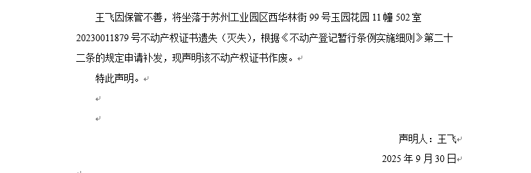 關于蘇州工業園區西華林街99號玉園花園11幢502室20230011879號不動產權證書遺失聲明