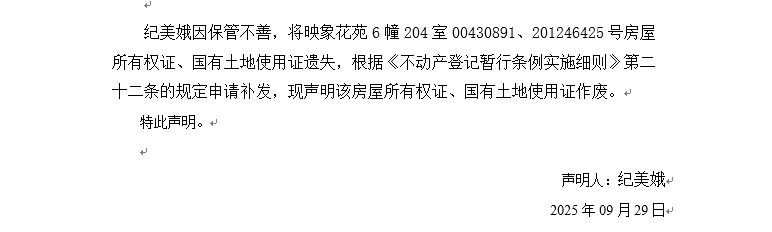 關于映象花苑6幢204室00430891、201246425號房屋所有權證、國有土地使用證遺失聲明