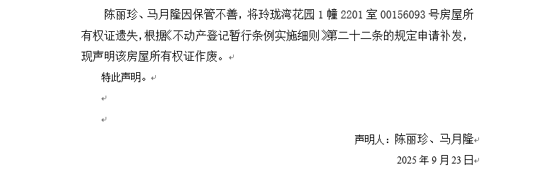 關于玲瓏灣花園1幢2201室00156093號房屋所有權證遺失聲明