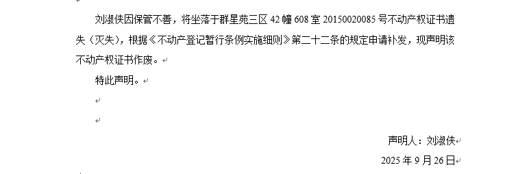 關(guān)于群星苑三區(qū)42幢608室20150020085號不動產(chǎn)權(quán)證書遺失聲明