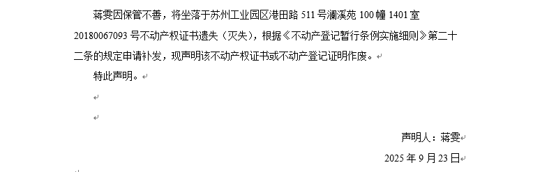 關于蘇州工業園區港田路511號瀾溪苑100幢1401室20180067093號不動產權證書遺失聲明