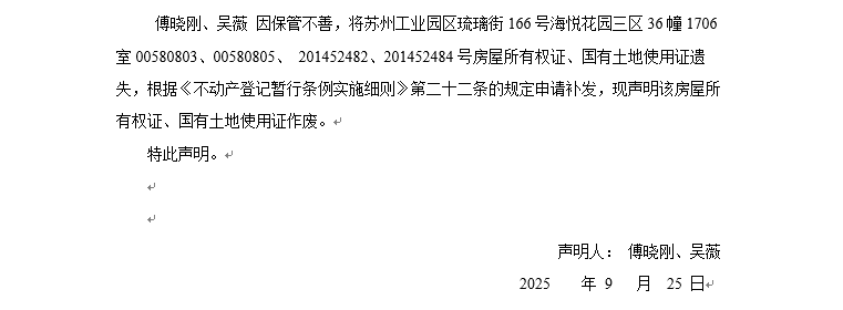 蘇州工業園區琉璃街166號海悅花園三區36幢1706室00580803、00580805 201452482、201452484號房屋所有權證、國有土地使用證遺失聲明