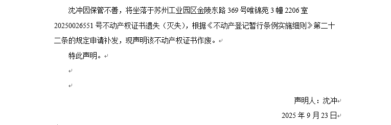 關(guān)于蘇州工業(yè)園區(qū)金陵?yáng)|路369號(hào)唯錦苑3幢2206室20250026551號(hào)不動(dòng)產(chǎn)權(quán)證書(shū)遺失聲明