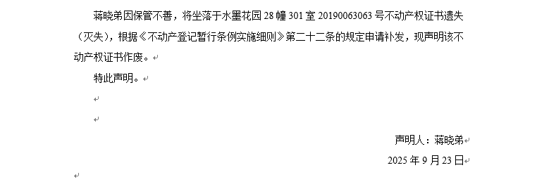 關(guān)于水墨花園28幢301室20190063063號不動產(chǎn)權(quán)證書遺失聲明