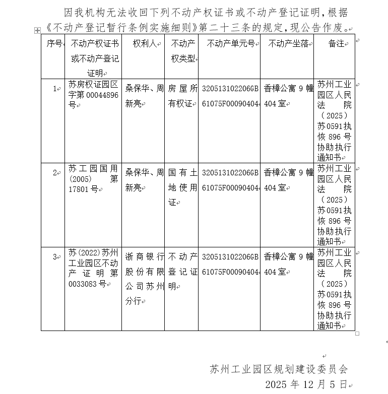 不動(dòng)產(chǎn)權(quán)證書/登記證明作廢公告蘇園 證廢字2025(0193)號(hào)(香樟公寓9幢404室)