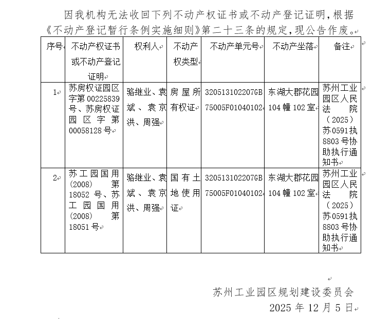 不動產權證書/登記證明作廢公告蘇園 證廢字2025(0183)號(東湖大郡花園104幢102室)