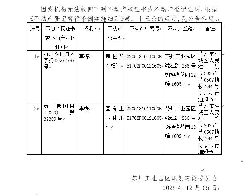 不動產權證書/登記證明作廢公告蘇園 證廢字2025(0187)號(橄欖灣花園12幢1605室)