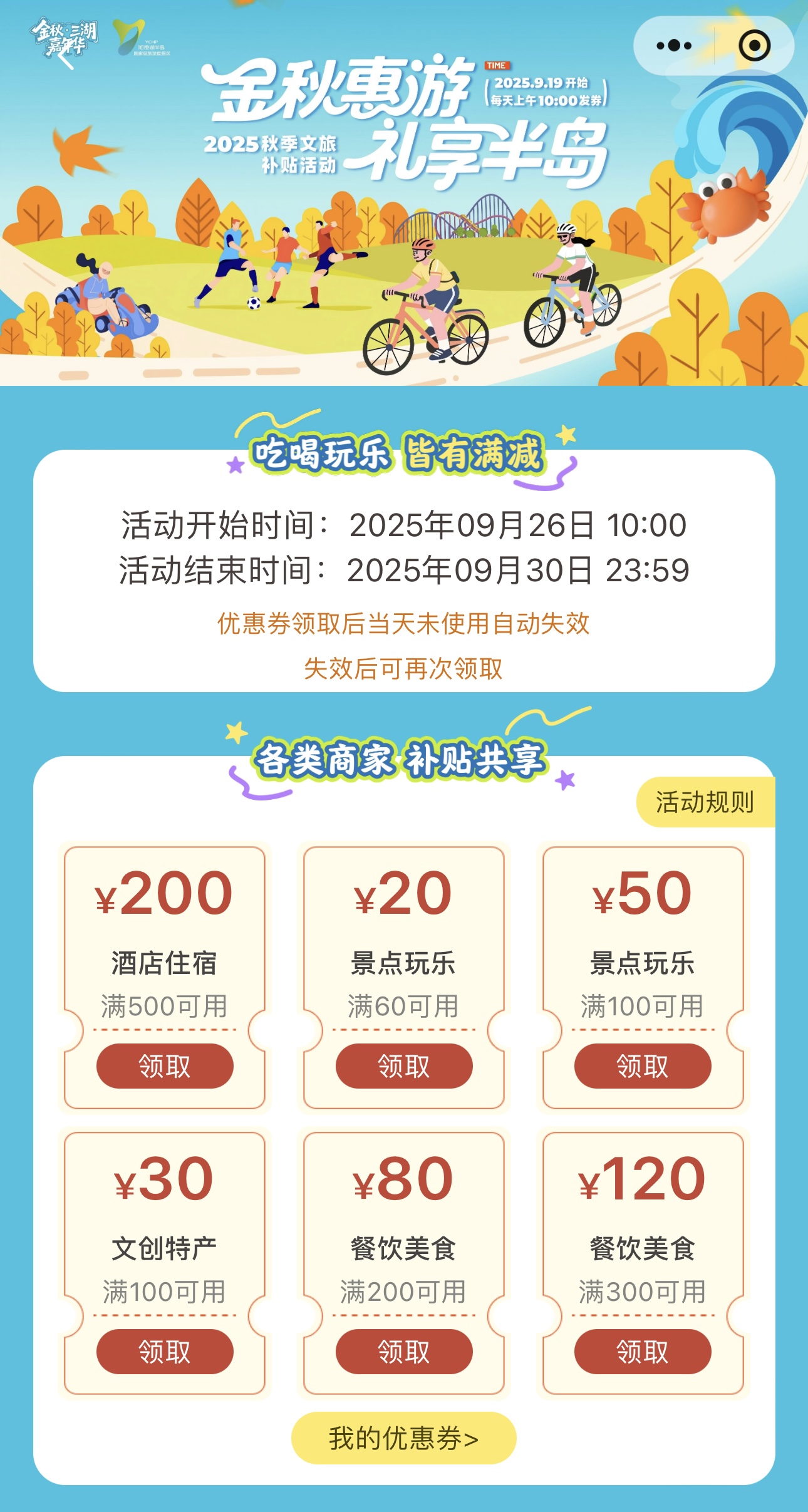 即日起至9月30日,每日10:00起,“惠游園區(qū)”小程序?qū)⑾蘖堪l(fā)放文旅消費(fèi)券,覆蓋餐飲、住宿、文創(chuàng)、娛樂等多個(gè)場(chǎng)景。市民游客只需注冊(cè)登錄小程序,進(jìn)入文旅消費(fèi)活動(dòng)專題頁面,即有機(jī)會(huì)領(lǐng)取不同面額的優(yōu)惠券,數(shù)量有限、先到先得。