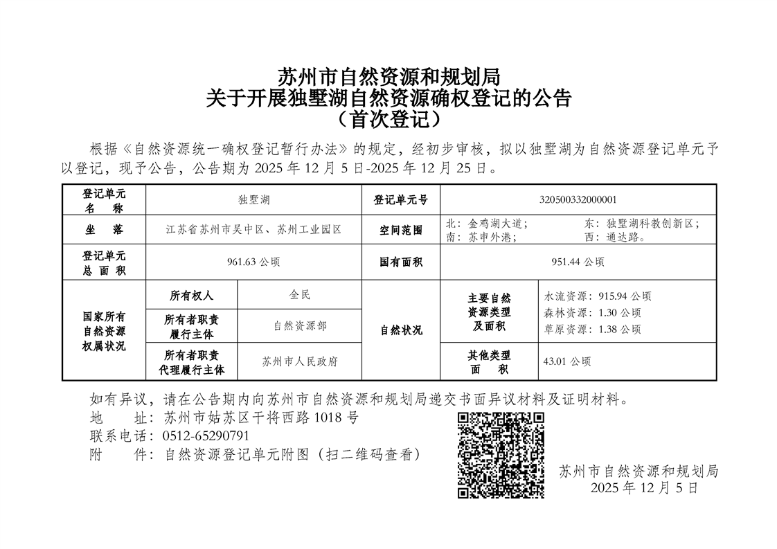 蘇州市自然資源和規劃局關于開展獨墅湖自然資源確權登記的公告(首次登記)
