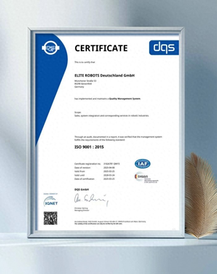 最近、蘇州工業園區の企業エリートロボットは、中國「ISO9001 三體系認証」取得に続き、ELITEROBOTSドイツ有限公司がドイツ國內のISO9001品質マネジメントシステム認証を正式に取得した。國産協働ロボット分野では初めてドイツ國內の認証を取得した中國企業となり、EUのハイエンド市場への參入に固い基盤を築いた。