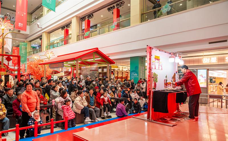 為了更好地渲染新年氛圍,年貨大街還特設(shè)古風(fēng)民俗區(qū),擁有糖畫、吹糖人、木刻年畫、新春剪紙等傳統(tǒng)手藝攤位,吸引了眾多市民駐足觀賞,親自體驗(yàn)。而在喜市游園互動(dòng)現(xiàn)場(chǎng),風(fēng)雅頌市集體驗(yàn)、漢服照相館、非遺手作、民俗特色皮影戲、古風(fēng)巡游等環(huán)節(jié)讓人仿佛穿越時(shí)空,沉浸式地體驗(yàn)了一把姑蘇繁華時(shí)期的熱鬧街市景象。