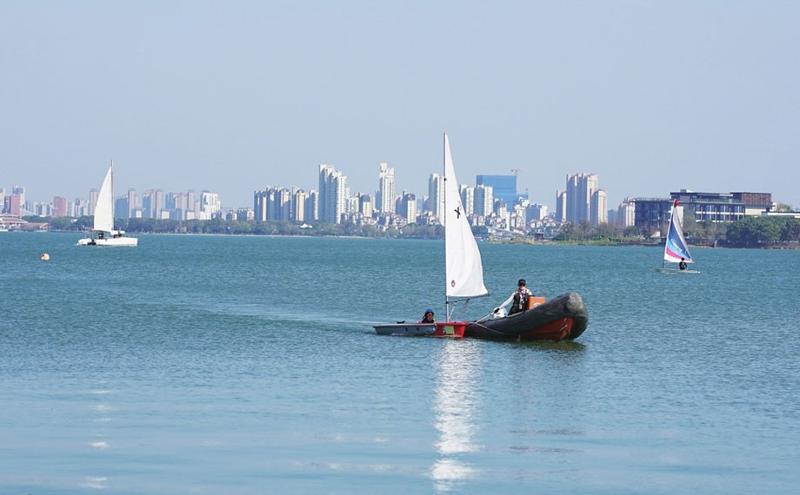 昨日,園區(qū)金雞湖春風(fēng)和煦,水上運(yùn)動項目熱度大增。在風(fēng)之園碼頭附近水域,皮劃艇劃過碧藍(lán)的湖面。