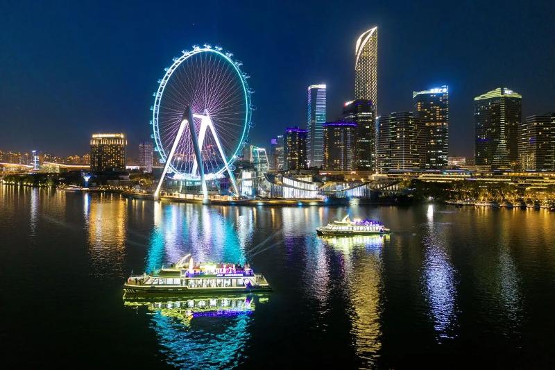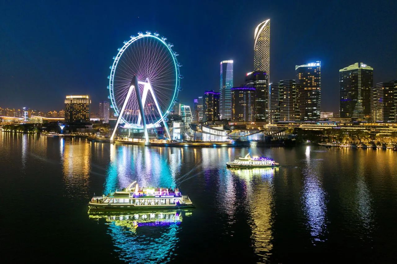 如果說“蘇州之眼”是天空的詩篇,那么右岸新航線就是水面的畫卷。夜幕降臨,“蘇州之眼”摩天輪星光閃耀,金雞湖雙體新游船霓虹流轉(zhuǎn),水岸光影交相輝映,為園區(qū)這座現(xiàn)代化新城更添了幾分夢幻與浪漫色彩,令人流連忘返。