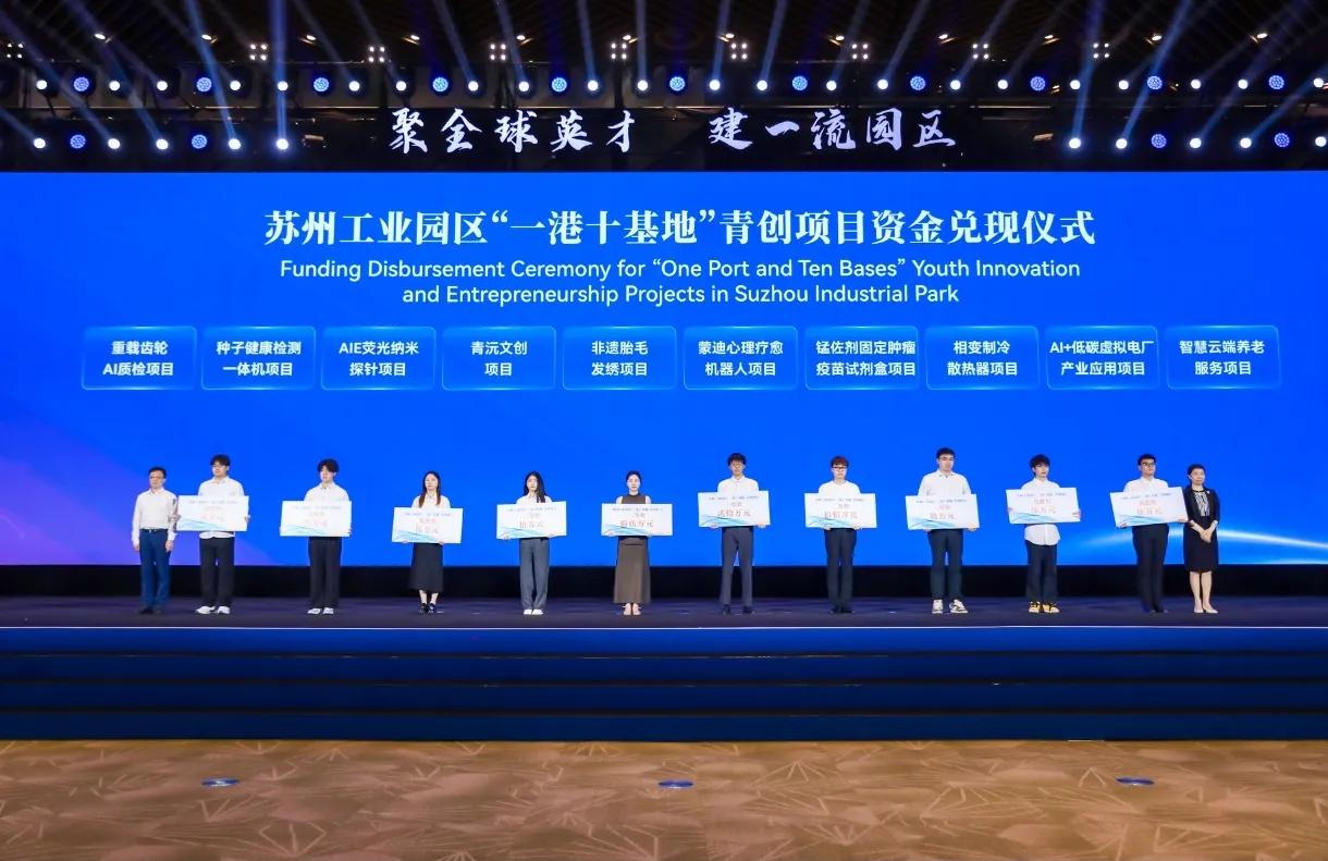 青年是城市發展的活力源泉。今年3月,園區發布“園夢未來”青年人才創新創業三年行動計劃,打造“一港十基地”青創空間,新設1億元青創資金專項用于遴選青年人才項目。新政實施以來,累計舉辦56場青創活動,改造4個人才社區,發放415張人才房票,補貼金額超5300萬元,引進青年人才超4萬。開幕式上,園區“一港十基地”青創項目資金正式兌現,為“一港十基地”項目路演一二三等獎及優勝獎等10個獲獎項目兌現青創資金。