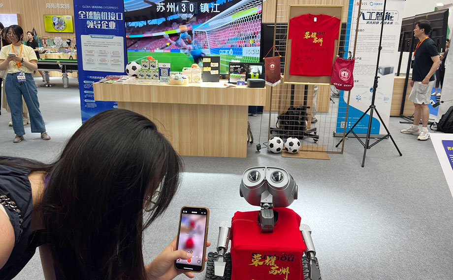 展會現(xiàn)場,人工智能應用也與“蘇超”隔空對話。在蘇超互動區(qū),曾作為蘇超機器人領隊并在中場表演中展示魅力的明星機器人WAWA一邊移動一邊擺動手臂,與圍觀人群熱情互動。