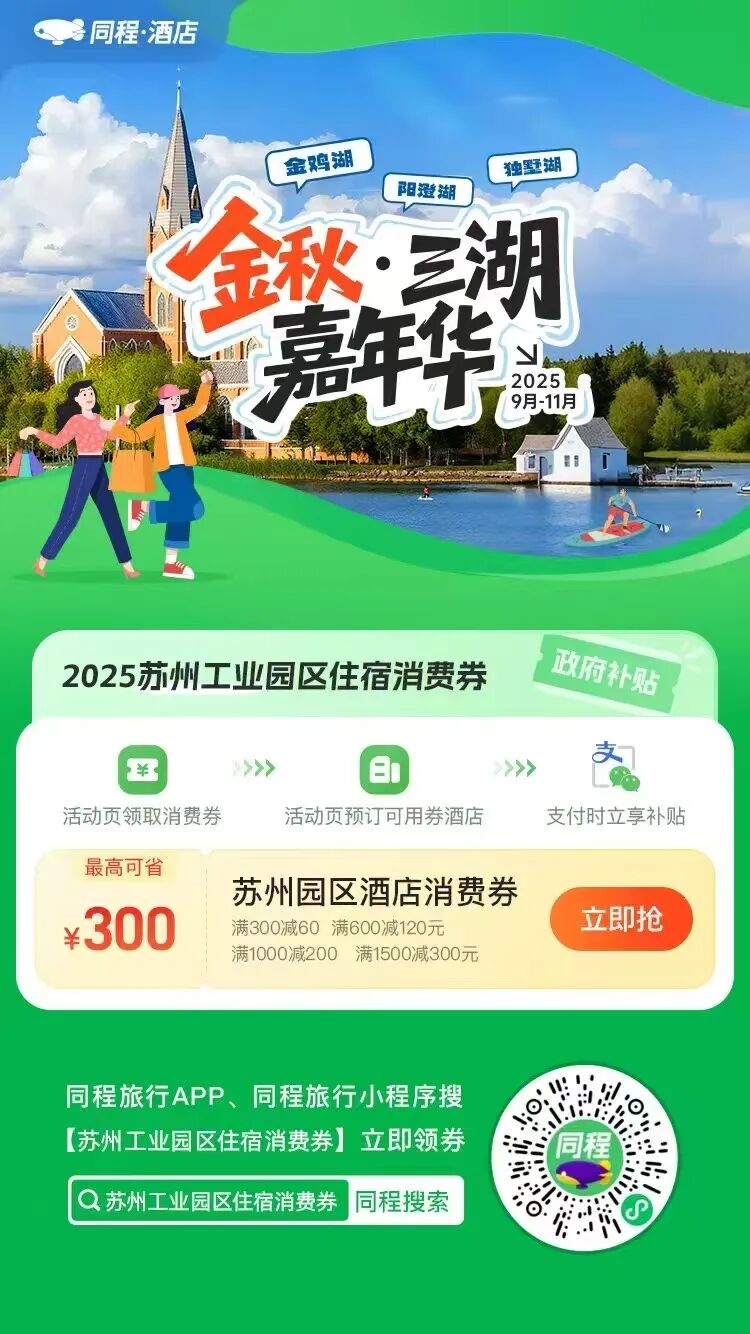在住宿文旅領(lǐng)域,園區(qū)聯(lián)合同程旅行平臺發(fā)放百萬級住宿消費(fèi)紅包,市民游客登錄同程旅行APP或小程序,搜索“金秋?三湖嘉年華”進(jìn)入專題頁面即可一鍵領(lǐng)取住宿文旅消費(fèi)券,在活動頁預(yù)訂可用券酒店,支付時(shí)立享補(bǔ)貼,最高可減300元。