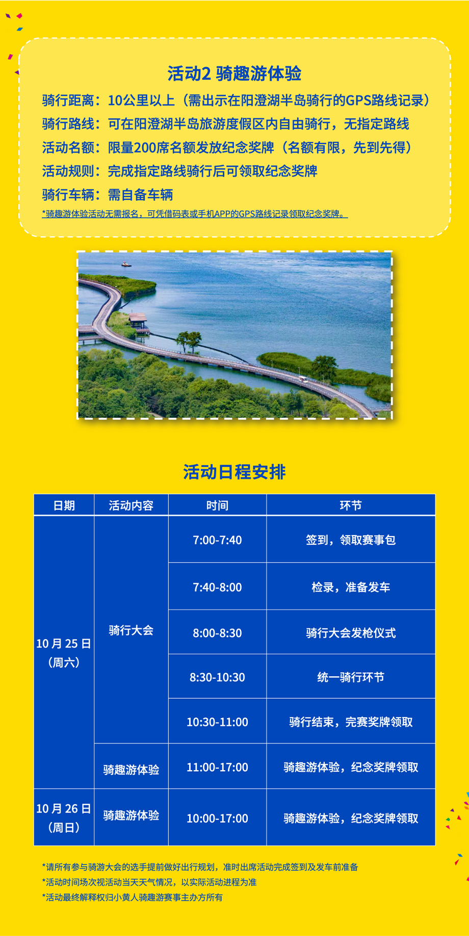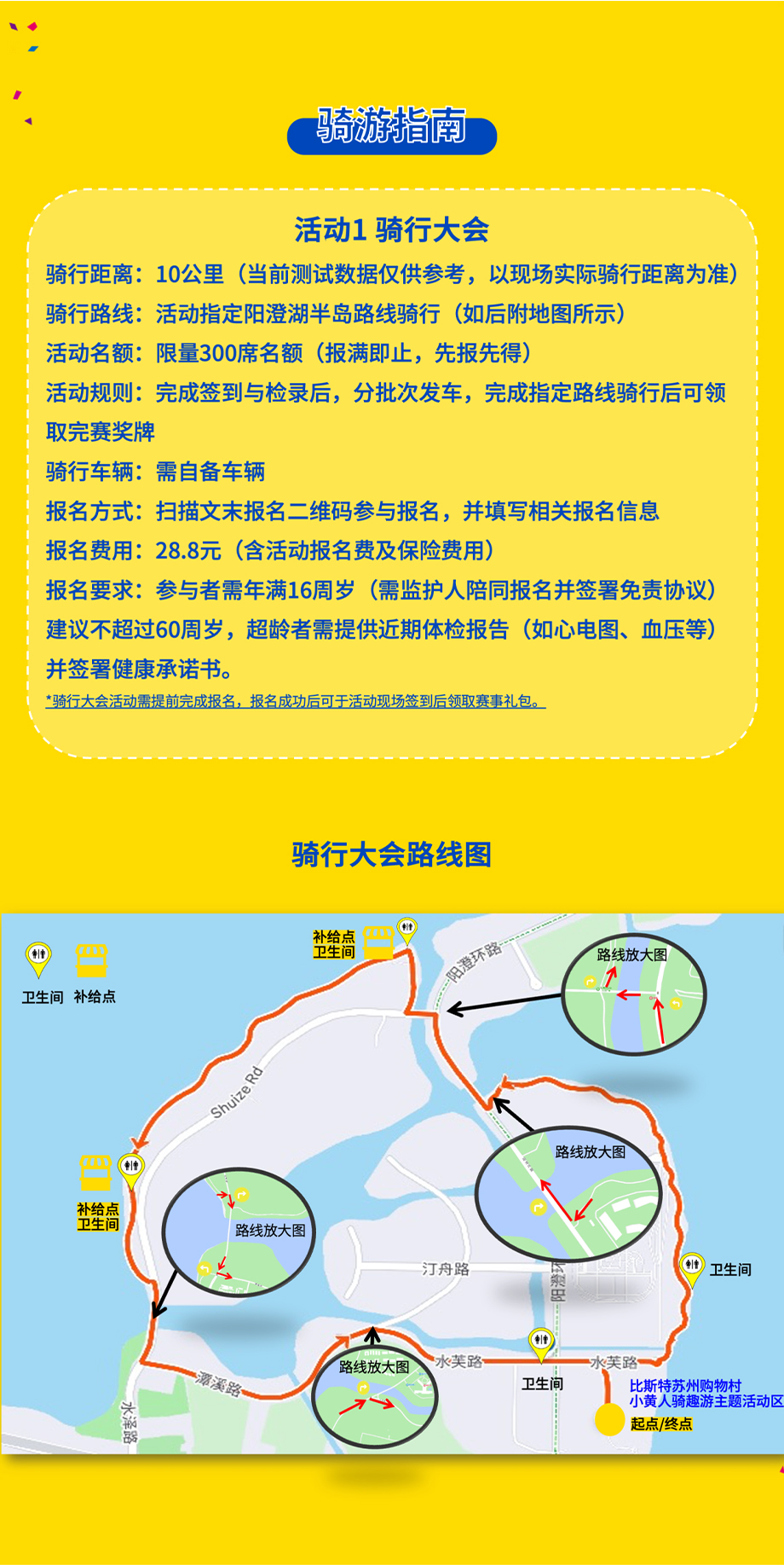 此次活動分為騎行大會、騎趣游體驗兩種形式,騎行大會需自備車輛、按照指定路線騎行,騎行距離約為10公里,參與者需年滿16周歲,完成指定路線騎行后可領(lǐng)取完賽獎牌,報名費用為28.8元;騎趣游體驗也需自備車輛,可在陽澄湖半島旅游度假區(qū)內(nèi)自由騎行,騎行距離為10公里以上(需出示在陽澄湖半島騎行的GPS路線記錄),完成騎行后可獲得紀(jì)念獎牌(限量200席名額),該項活動無需報名,可憑借碼表或手機(jī)APP的GPS路線記錄領(lǐng)取紀(jì)念獎牌。