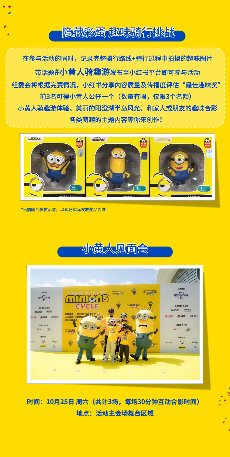 此外,在參與活動的同時,記錄完整騎行路線+騎行過程中拍攝的趣味圖片,帶話題#小黃人騎趣游發(fā)布至小紅書平臺還可參與“隱藏彩蛋趣味騎行挑戰(zhàn)”活動,后續(xù)活動主辦方將根據(jù)完賽情況、小紅書分享內(nèi)容質(zhì)量及傳播度評估“最佳趣味獎”,前3名可獲得小黃人公仔一個。