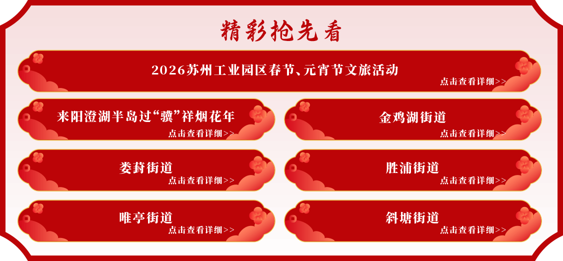 春節的腳步漸近,園區的年味也日漸醇厚。今年,園區聚焦“穩崗、普惠、孝心、共享”,為不同群體精心準備了一份誠意滿滿的“新春暖心菜單”,讓留蘇建設者、來蘇家庭、機構長者、一線崗位工作者等都能找到歸屬與歡樂。禮遇建設者 文旅大禮包讓“在園區過年”更有溫度今年春節,園區將溫情直送一線,以“新春有你,園區有禮”為主題的暖心系列行動陸續深入街道、社區與企業集宿區,為留蘇過年的務工人員及家人帶來別樣年味。活動現場將設置非遺互動專區,邀請大家親手寫春聯、剪窗花、體驗蘇式年畫,在筆墨紙香與巧手翻飛中重溫傳統年俗。同時,園區精心準備的新春文旅大禮包將同步發放,內含金雞湖景區、蘇州中心等多個... [詳細]