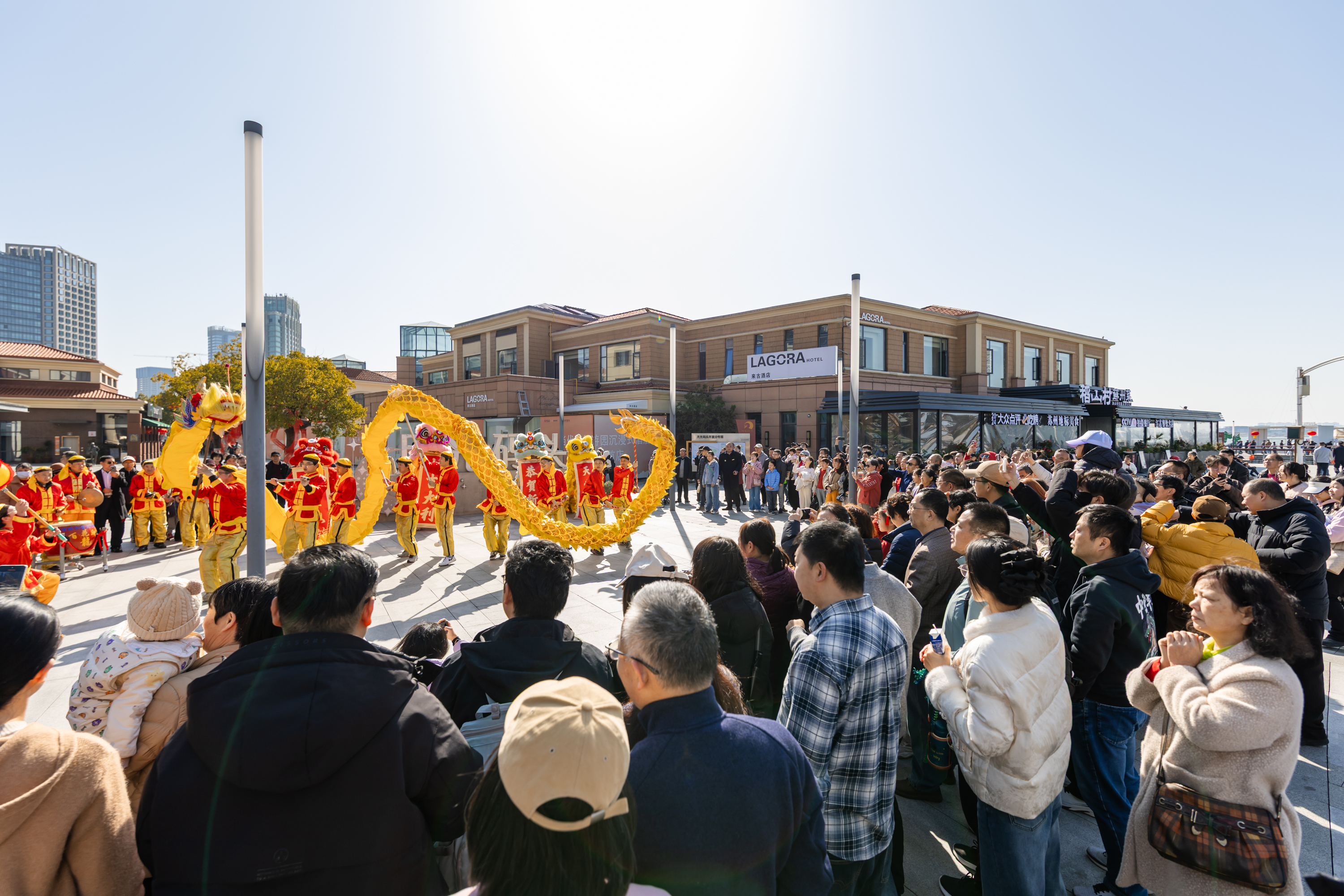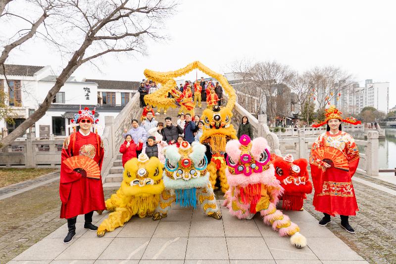 大年初一、初五,園區圓融時代廣場、斜塘老街、月光碼頭、李公堤四大商圈人聲鼎沸、鑼鼓喧天,由蘇州市舞龍燈非物質文化遺產代表性傳承人蔣達夫帶領的百花洲龍燈隊,為市民游客獻上了一場場氣勢恢宏的舞龍舞獅表演,用傳統民俗點燃新春喜悅。