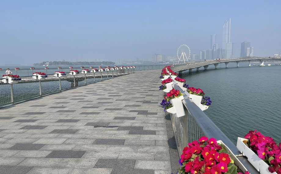 在蘇州大道(現(xiàn)代大道-月廊街)、金雞湖人行棧橋、金雞湖大橋及飛翔雕塑等重要窗口區(qū)域,三千多組馬鞍式花箱煥新亮相。