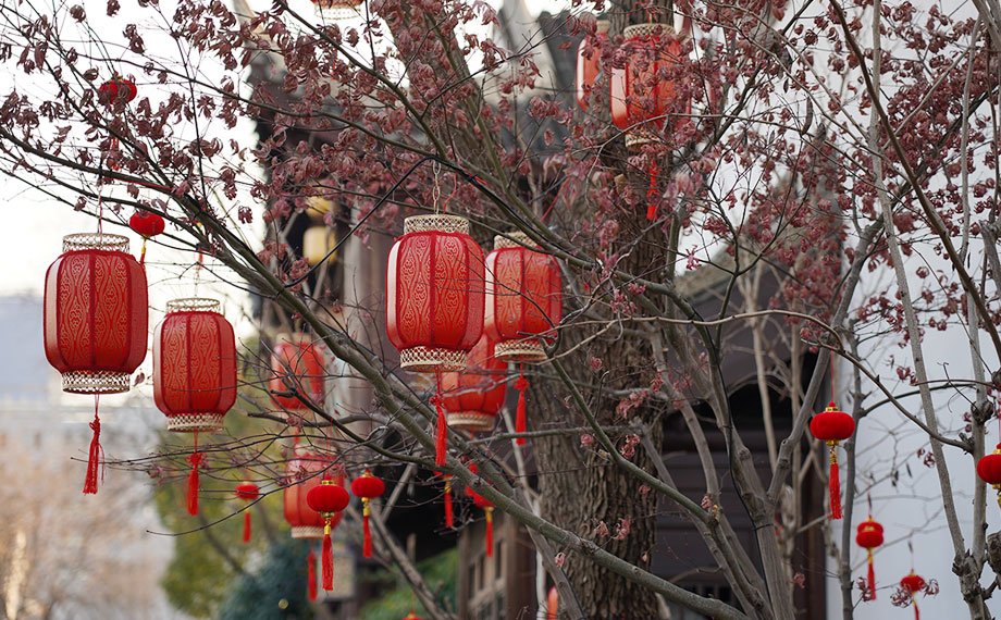 在斜塘老街,各式各樣的燈籠與傳統(tǒng)的蘇式建筑相得益彰,為原本因季節(jié)更迭而顯得枯寂的樹木點(diǎn)綴上鮮艷的色彩。
