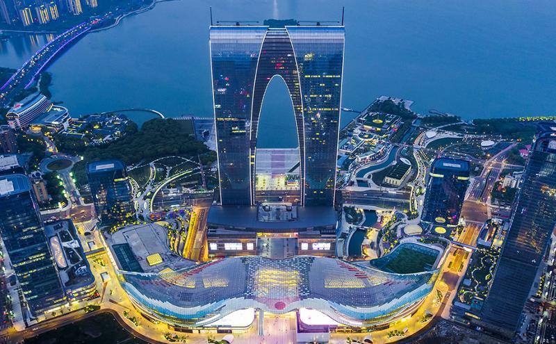 從東環路轉金雞湖大道,再向北進入星港街,園區的現代繁華撲面而來。金雞湖天虹、蘇悅廣場、星悅匯、蘇州中心商場等商貿載體集聚湖西。其中,星悅匯是二次元愛好者的天堂,蘇州中心商場更是市民游客不可錯過的城市打卡地之一。