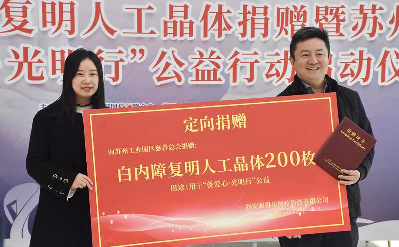 崇德向善,與愛同行。12月24日上午,蘇州“僑愛心·光明行”公益行動啟動儀式在蘇州工業(yè)園區(qū)舉行。現(xiàn)場,愛心企業(yè)西安眼得樂醫(yī)療科技公司向蘇州工業(yè)園區(qū)慈善總會定向捐贈白內(nèi)障復(fù)明人工晶體200枚,后續(xù)將由蘇州九龍醫(yī)院推進落實,惠及在蘇僑胞及全市眼部疾病患者。