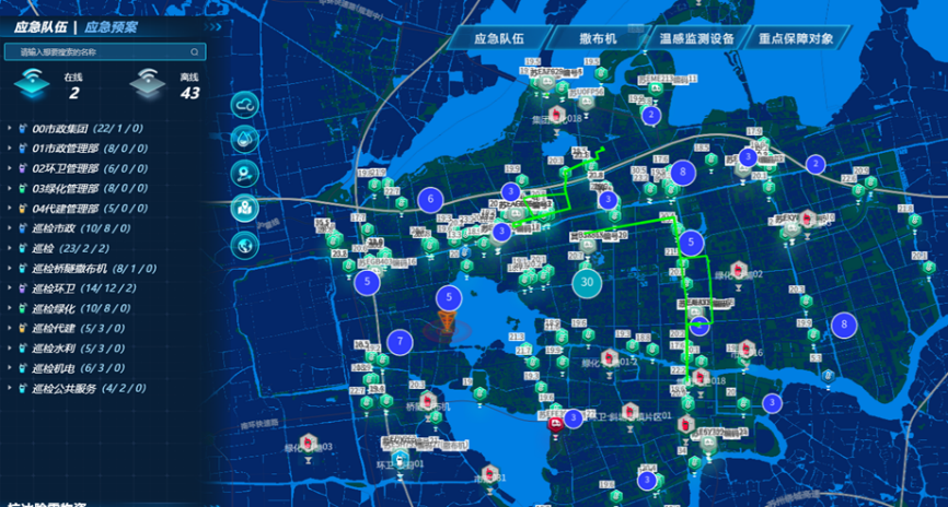 依托具備感知終端的監(jiān)測與調(diào)度平臺,市政服務(wù)集團構(gòu)建起“感知-傳輸-分析-應(yīng)用”的清雪除冰應(yīng)急保障管理閉環(huán)。系統(tǒng)一旦感知結(jié)冰風(fēng)險條件形成,能夠自動觸發(fā)預(yù)警信息,并生成作業(yè)建議,快速鎖定預(yù)警點位,啟動精準(zhǔn)處置,改變傳統(tǒng)“憑經(jīng)驗、靠巡查”的被動模式。平臺界面實現(xiàn)預(yù)警點位、應(yīng)急隊伍、撒布機作業(yè)線路的多圖層疊加展示,支持應(yīng)急資源實時調(diào)度與動態(tài)跟蹤,應(yīng)急處置效能顯著提升。