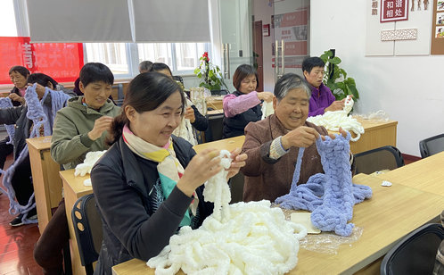 另一邊,“紅管”志愿者正帶領老人們學習手指圍巾的編織方法。無需編織針,僅憑雙手就能完成。大家跟隨講解認真練習,起初手法略顯生疏,棉線總是纏繞打結,但大家遇到問題時互相支招、分享竅門,指尖的棉線漸漸翻飛自如,現場氛圍溫馨融洽、其樂融融。一團團柔軟的棉線在一勾一繞間逐漸成形,一條條簡約實用的手指圍巾陸續完成。“這手指圍巾織起來簡單、速度又快,出門買菜散步戴著都合適!”李阿姨笑著展示自己的成果,滿足之情溢于言表。