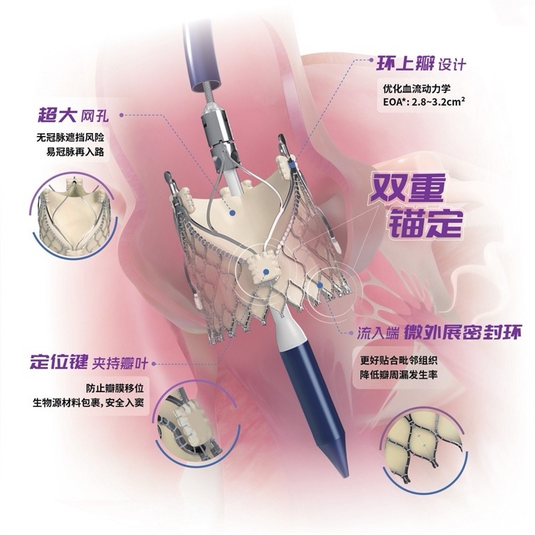 此次新獲批的TaurusTrio經導管主動脈瓣系統,采用全球首創的一體式定位鍵設計,徹底攻克了單純主動脈瓣反流患者面臨的器械錨定難題:系統自帶的270°調彎功能可讓器械和心臟瓣膜更貼合,加上360°全向精準操控,三個定位鍵可以牢牢“抓住”患者自身的瓣膜,輕松實現穩定固定。同時,瓣膜流入端的微外展密封環,緊密貼合主動脈瓣根部,不用再過度依賴“尺寸放大”的傳統方法來固定瓣膜,這就大大減少了術后需要裝心臟起搏器的風險,也降低了瓣膜裝得過高或過低的概率,進一步提升植入的穩定性和精準度。此外,一體式定位鍵還能和患者原生瓣膜的關鍵位置精準對齊,讓血液流動更順暢;搭配超大網孔設計,最大程度保留了心臟冠脈血管的通路,避免影響后續治療。