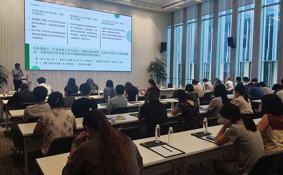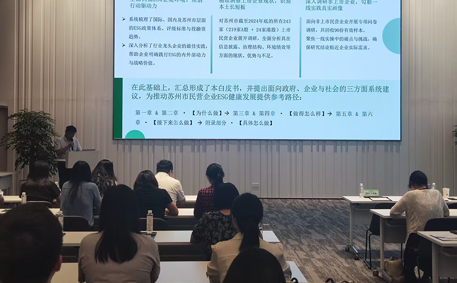 活動上,園區(qū)城市發(fā)展研究院分享了ESG發(fā)展近況及園區(qū)ESG領(lǐng)域的特色亮點(diǎn),展示了ESG公共服務(wù)平臺的相關(guān)功能模塊。蘇州市企業(yè)可持續(xù)發(fā)展聯(lián)合會介紹《蘇州市民營企業(yè)ESG發(fā)展白皮書》,圍繞白皮書編制背景與核心內(nèi)容進(jìn)行解讀。