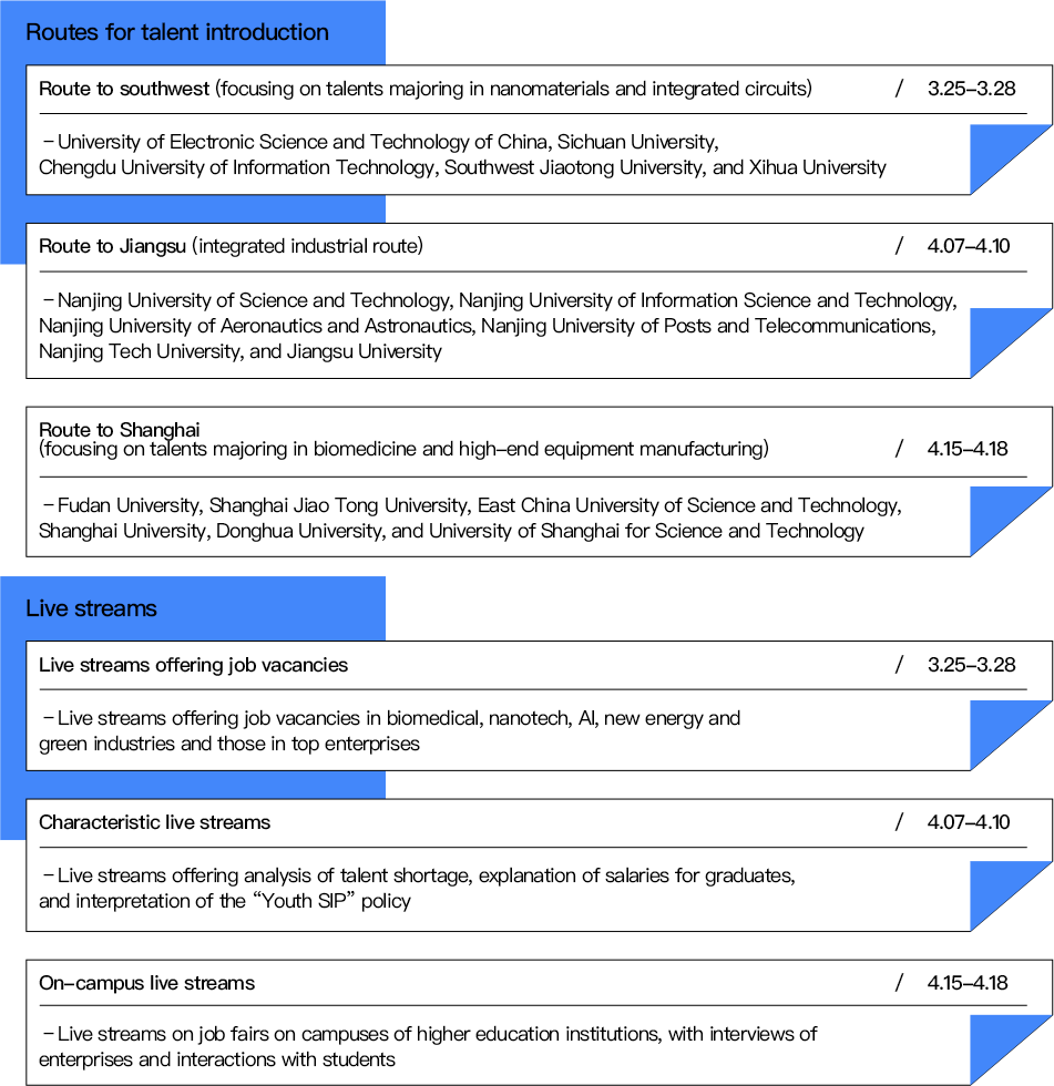 FromMar 25 to 28, the recruiters from 27 enterprises in SIP visited fiveuniversities in Chengdu, capital of Southwest China’s Sichuan province, wherethey offered job vacancies to graduating students majoring in nanotech, newmaterials and related subjects. Theevent was organized by Suzhou Nanotech Co Ltd and SIP Human ResourcesDevelopment Co Ltd under the su...