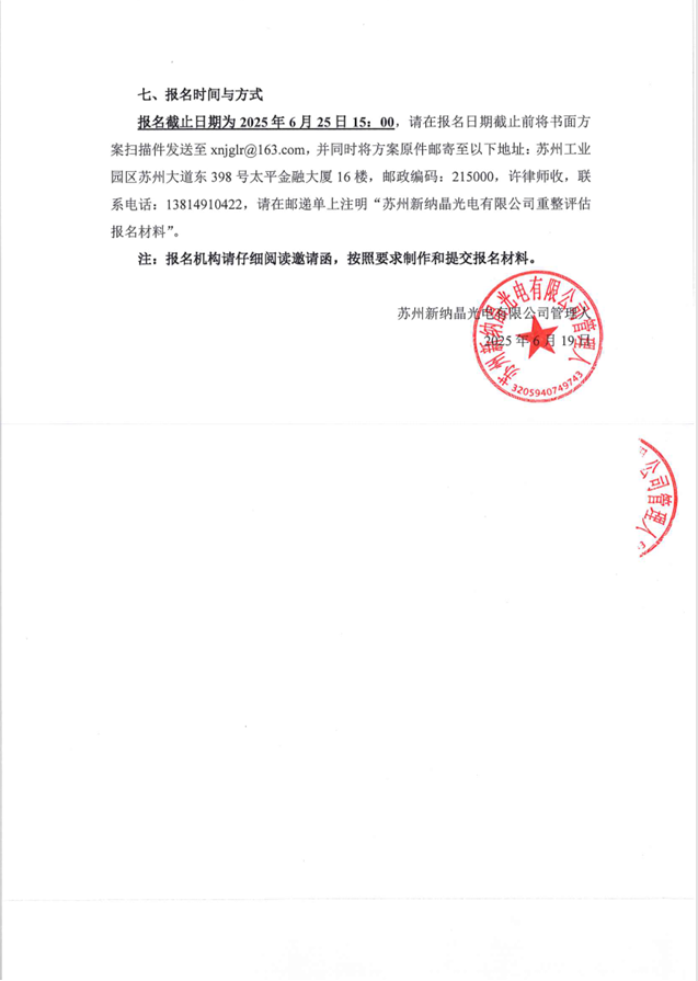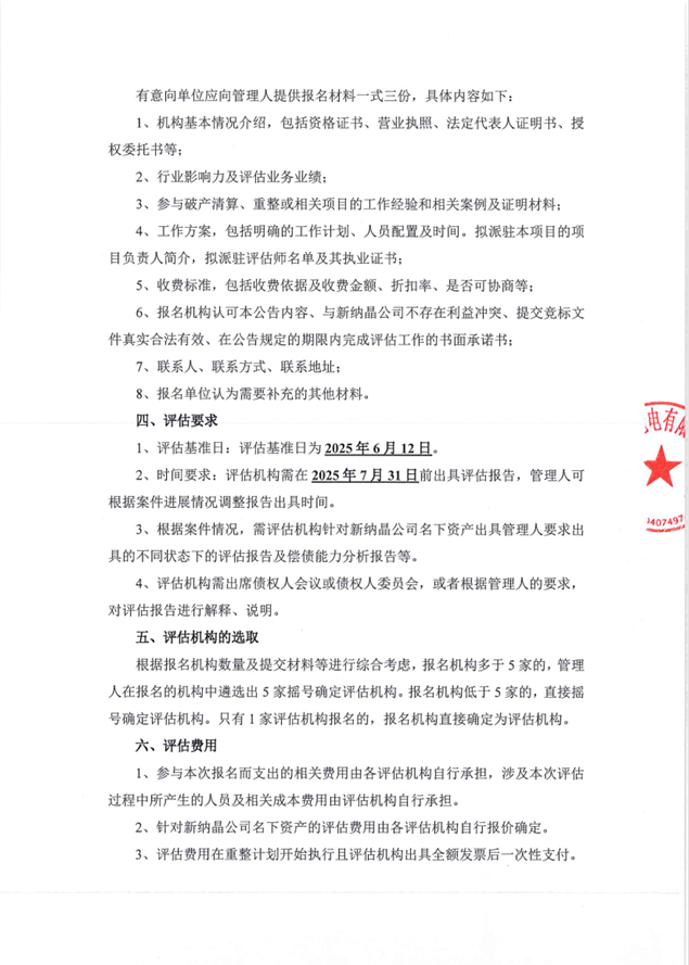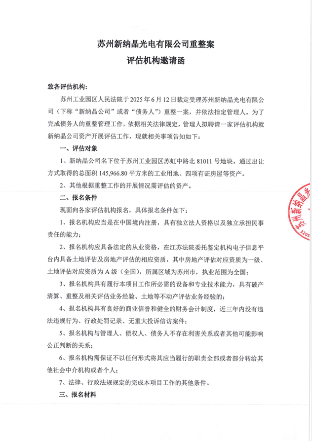 蘇州新納晶光電有限公司關(guān)于公開(kāi)招募評(píng)估機(jī)構(gòu)的公告