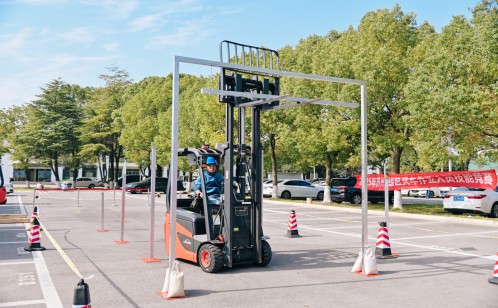 競賽設(shè)置預(yù)賽與決賽兩個(gè)階段,全方位檢驗(yàn)選手綜合素養(yǎng)。預(yù)賽環(huán)節(jié)采用“理論+實(shí)操”的考核模式:理論測試涵蓋叉車安全操作規(guī)程、設(shè)備日常維護(hù)、應(yīng)急處置流程及相關(guān)法律法規(guī)知識,重點(diǎn)考察選手安全理論功底與合規(guī)意識;實(shí)操項(xiàng)目為電動(dòng)平衡重叉車帶托盤競速繞樁,選手需在5分鐘內(nèi)完成“叉取托盤—轉(zhuǎn)運(yùn)堆疊—指定存放—倒庫停車”全流程,考驗(yàn)精準(zhǔn)操控與高效作業(yè)能力。經(jīng)綜合評定,40名選手憑借過硬實(shí)力脫穎而出,晉級決賽。