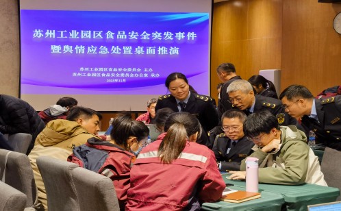 為全面提升食品安全突發事件協同應對能力,夯實食品安全保障防線,近日,蘇州工業園區組織開展了食品安全突發事件暨輿情應急處置桌面推演。推演小組以街道為單位,共分為5個小組,每組由2名市場監管部門執法人員、2名疾控部門流調人員、1名街道工作人員及1名教育局食品安全條線工作人員組成。園區市場監管局、教育局、衛健委及各街道食品安全分管領導和相關工作人員現場觀摩。