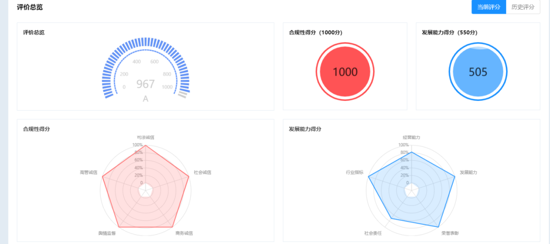 建立園區(qū)特色公共信用綜合評(píng)價(jià)體系,從合規(guī)性和發(fā)展能力兩個(gè)方面,對(duì)區(qū)內(nèi)全量市場(chǎng)主體信用狀況進(jìn)行評(píng)分,劃分為四級(jí)九等次并定期更新。