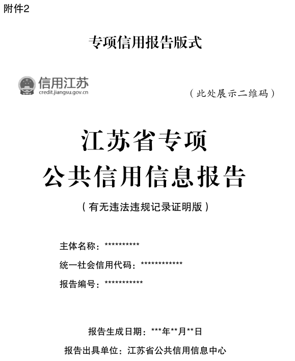 依托省公共信用信息系統(tǒng)共享經(jīng)營主體違法違規(guī)行為信息,并依申請為經(jīng)營主體開具江蘇省專項公共信用信息報告(以下簡稱專項信用報告),證明其報告期內在江蘇省行政區(qū)域內相關領域有無違法違規(guī)記錄的情況,替代經(jīng)營主體赴多個部門(單位)單獨出具的有無違法違規(guī)記錄證明。