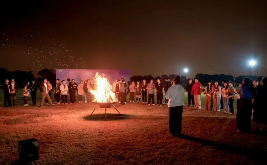 轉(zhuǎn)場營地,草地上的半島品牌宣傳片率先登場,向大家推介文體旅好風(fēng)光。在音符跳動中,通過“歌詞尋人”、“不能做”挑戰(zhàn),一場“不刻意、不尷尬”的破冰音樂會悄然提升現(xiàn)場溫度。暖場過后,話題卡片引導(dǎo)參與者進(jìn)入美食社交環(huán)節(jié),烤肉香氣里飄蕩著天南海北的故事與歡笑。星空之下,圍爐夜話、休閑游戲喚醒了現(xiàn)場的掌聲、歡呼聲,壓軸煙花秀點亮了湖畔夜空、點燃了青春激情,心動互選環(huán)節(jié)更是把氣氛推向高潮。